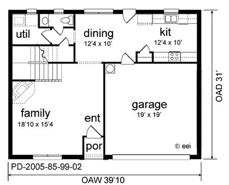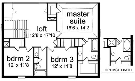 | Description: This budget minded plan is great for the active family. The large living room has room for a fireplace and features open stairs. The generous dining/kitchen area has lots of view to the back, direct garage access and powder bath nearby. Under the stairs is valuable storage with a handy utility room. Upstairs features a large play area and a study loft. Both large bedrooms have walk-in closets. The oversized master suite has vaulted ceiling, two walk-in closets and optional separate shower.