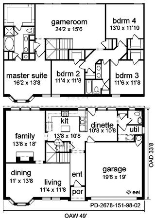 Description: This plan is for a growing family on a budget. The formal living/dining greet you from the entry. The family room has a fireplace and view to the backyard. The large kitchen sports an island, pantry and breakfast counter. The half-bath, garage and utility are conveniently placed off the dinette. Upstairs, three bedrooms, each with a walk-in-closet, share a large bath. The oversized gameroom has a great view of the backyard. And the master suite has a double vanity, garden tub, shower and large closet. This compact house sports a traditional elevation with bay windows and brick veneer.
