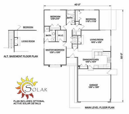 Description: Features three bedrooms and an attached garage. Welcoming entry leading to Living Room with optional fireplace Well equipped U-shaped Kitchen with Snack Bar Laundry conveniently located in the bedroom area Master Bedroom with walk-in closet and private Bath. Plan includes optional Active Solar Details.