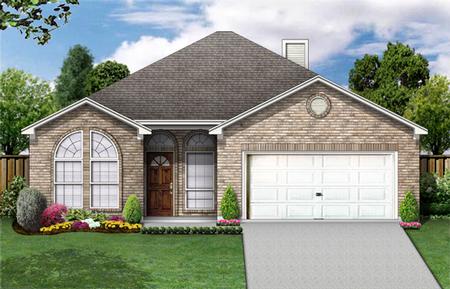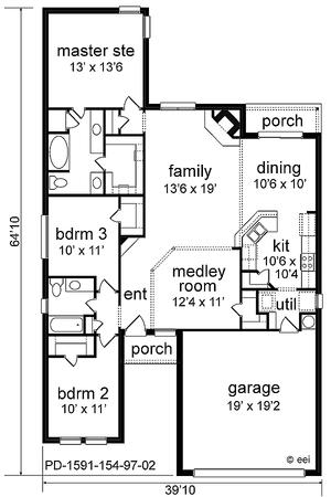 | Description: Classic styling for a beginning family. This narrow plan offers separated bedrooms and lots of view to the backyard. The "medley room" can be used as a study or formal dining room. The family room has a corner fireplace and is open to the dining room and kitchen. The utility mud room of the garage has natural light and room for shelves. All bedrooms have walk-in closets, as does the medley room. The private master suite has two vanities, a tub shower, and oversized linen closet which could be converted to a shower. The classy elevation features arched windows and brick detailing.