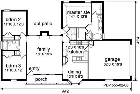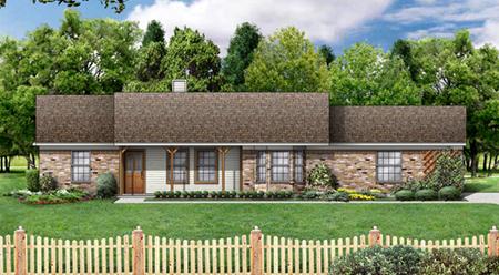 | Description: Country living on a budget? This classic plan features a large living room with view to the front or back. The kitchen has a breakfast bar and the dining room is charming with a bay window. Two bedrooms share a bath off a private hall. The utility closet is conveniently located between the kitchen and master suite. A spa tub, separate shower, and two closets make the master suite a special retreat. The front swing porch adds charm to this simple to build plan.
