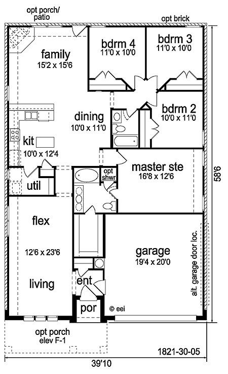 | Description: This plan lives large! Separate entry w/coat closet ushers you into the "flex living area" which can be a combo living/formal dinning or 2nd family room. Kitchen features an island & sit down bar area. The utility has room for a freezer or cabinet. 3 bedrooms each have large closets, & the master suite has a garden tub & optional shower. Charming Craftsman elevation features a large front porch & attic dormers.